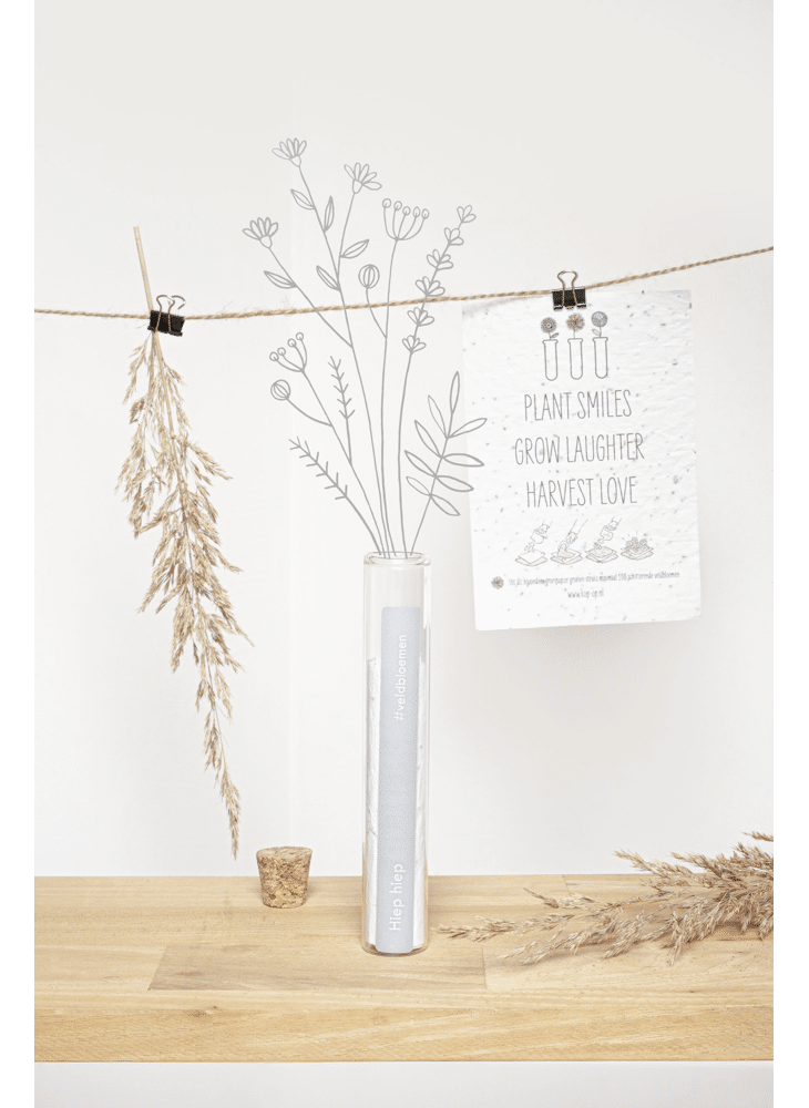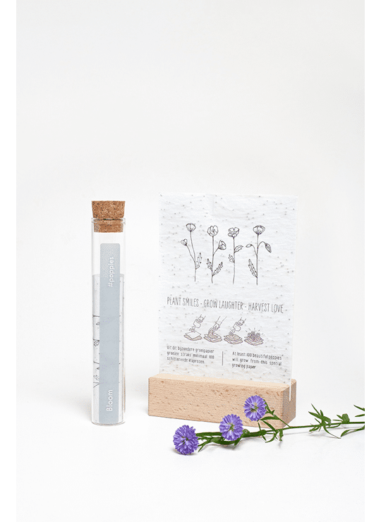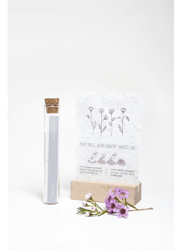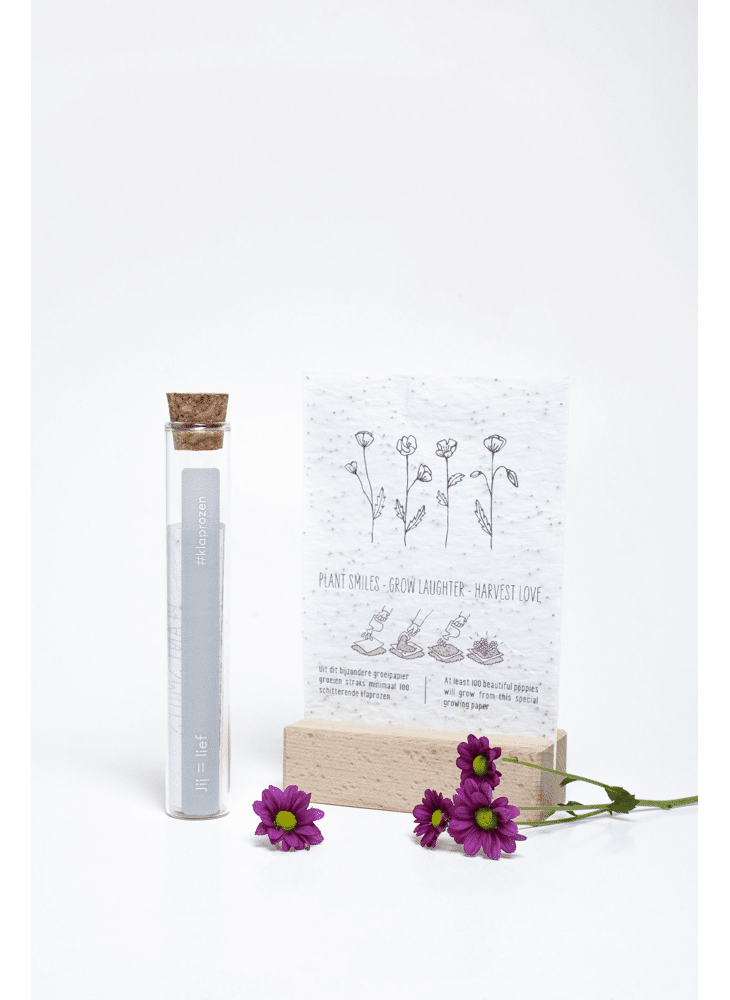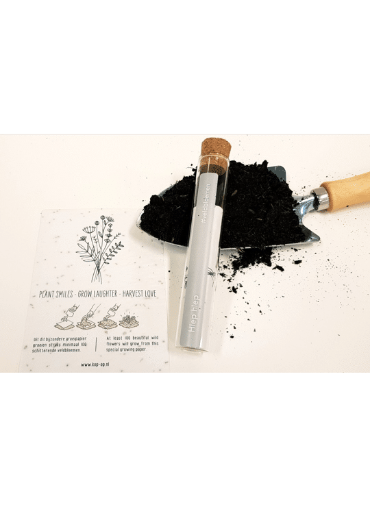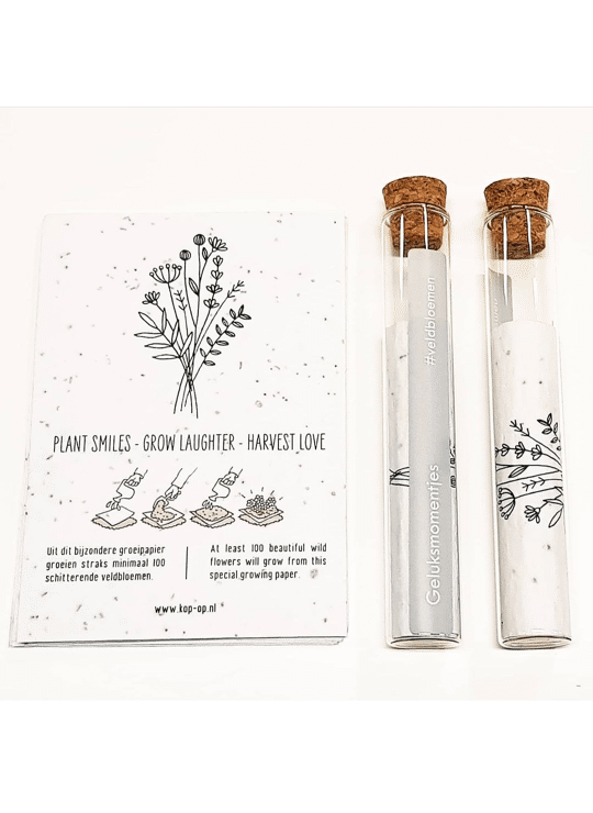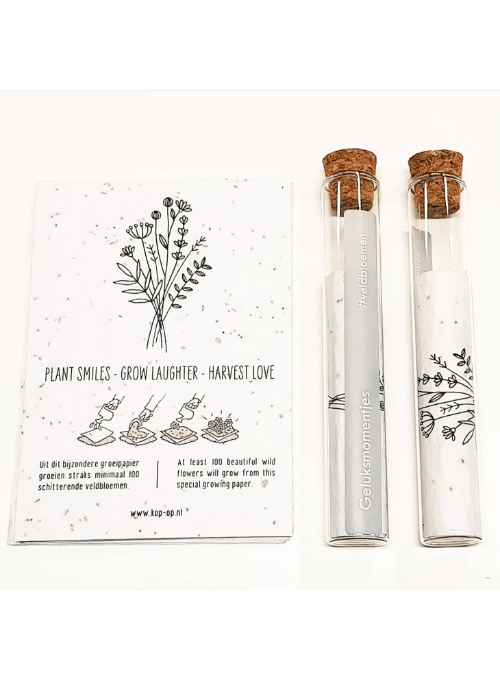 In het reageerbuisje zit het Kop op! groeipapier met daarin minimaal 100 kleine blijmakers (= bloemzaadjes). De zaadjes gaan er gegarandeerd voor zorgen dat er heel lang kan genoten worden van dit kado.
