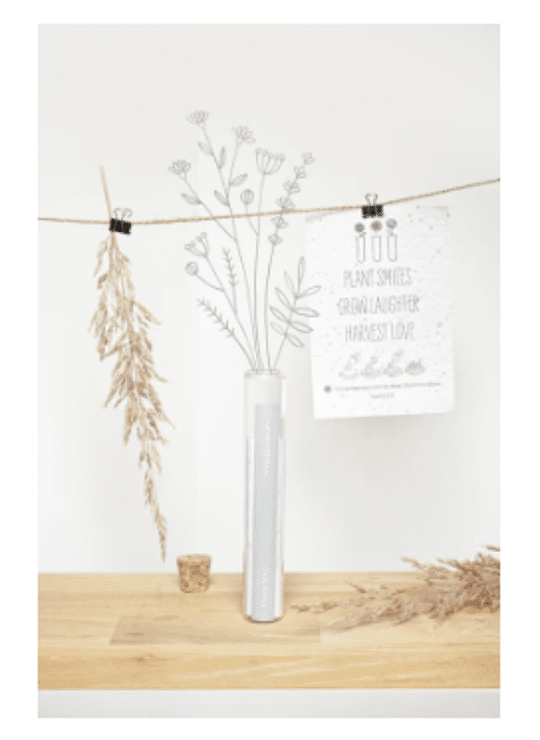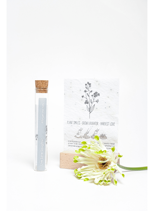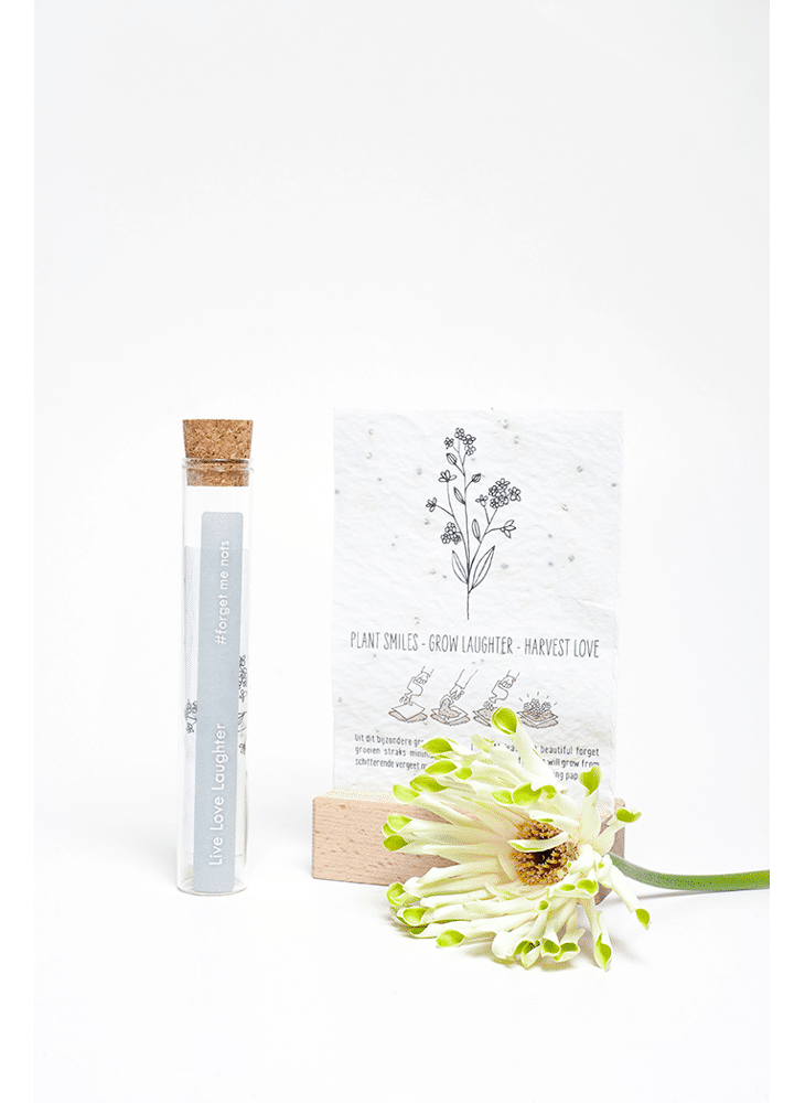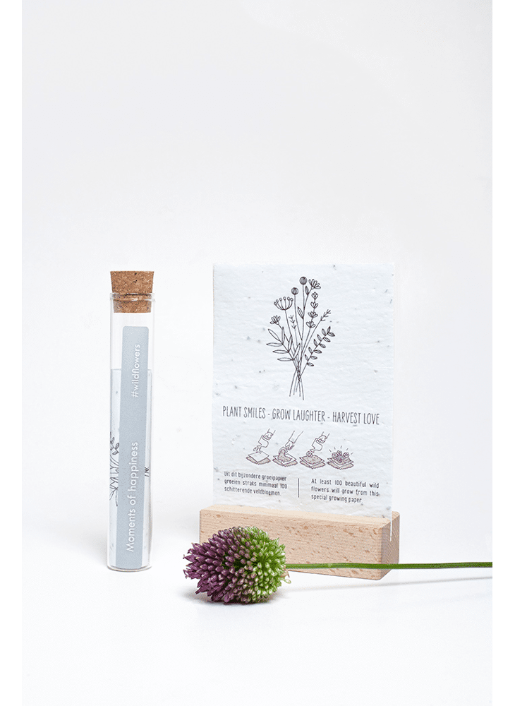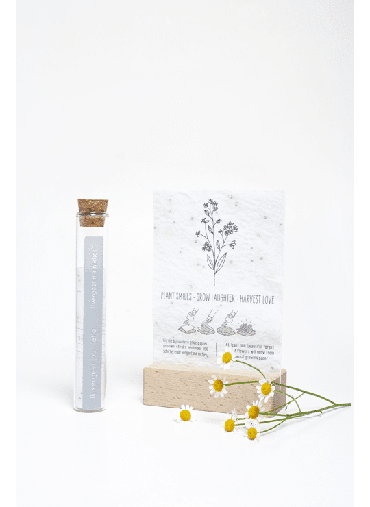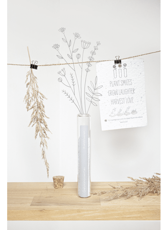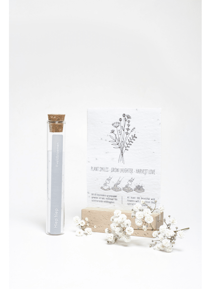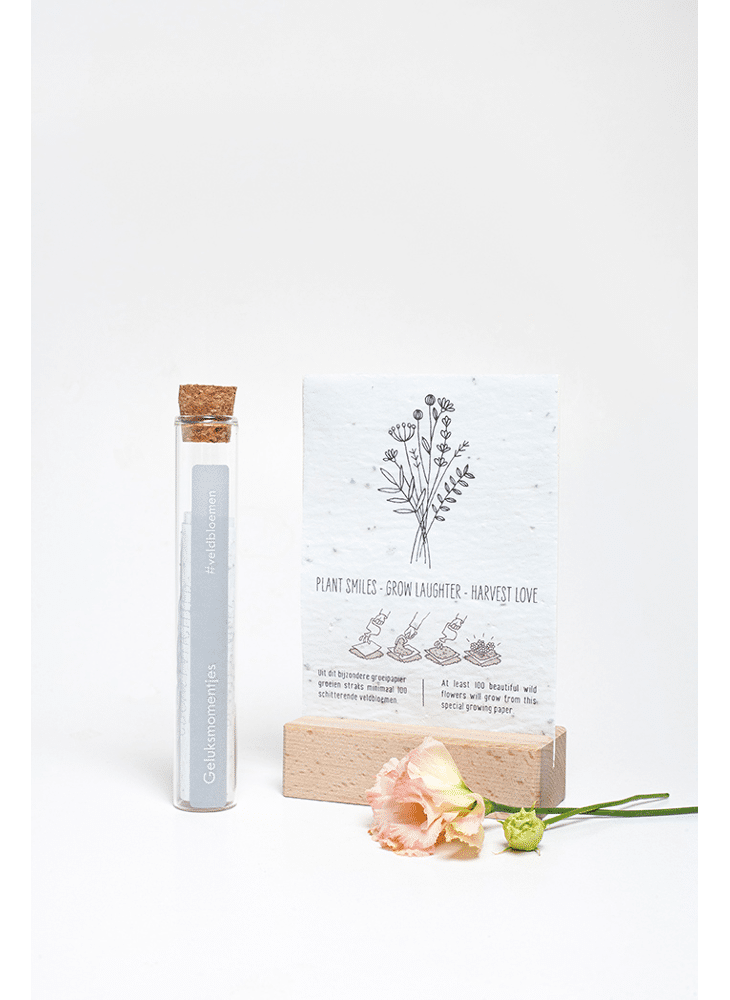 In het reageerbuisje zit het Kop op! groeipapier met daarin minimaal 100 kleine blijmakers (= bloemzaadjes). De zaadjes gaan er gegarandeerd voor zorgen dat er heel lang kan genoten worden van dit kado.