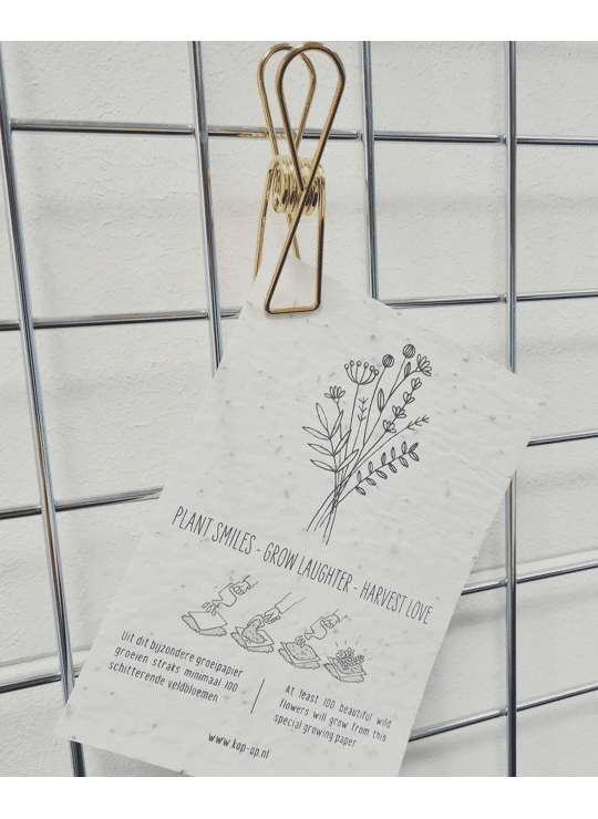 1 vel groeipapier met 100 zaadjes met tekst "plant smiles, grow laughter, harvest love"