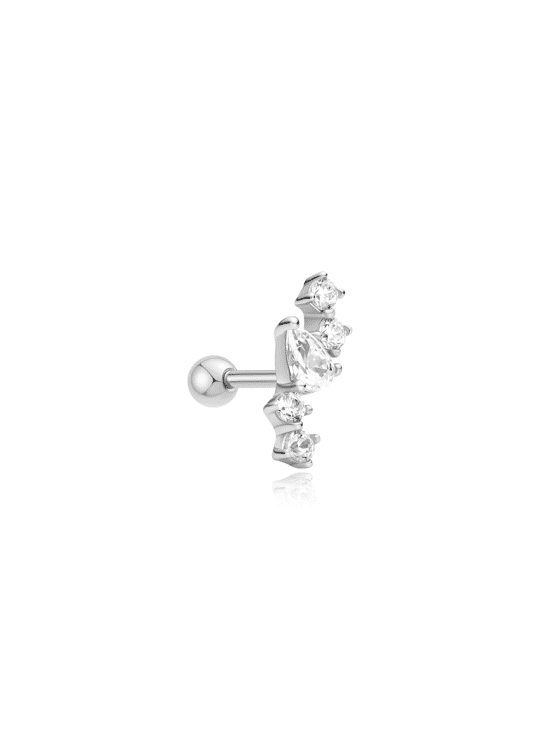 Ontdek een subtiel maar opvallend sieraad met de Constellation Barbell single earring van Ania Haie. Deze elegante oorbel heeft een speels zigzagdesign met een peervormige cubic zirconia steen in het midden, aangevuld met twee asymmetrisch geplaatste steentjes. Een verfijnde combinatie van organische vormen en moderne lijnen.