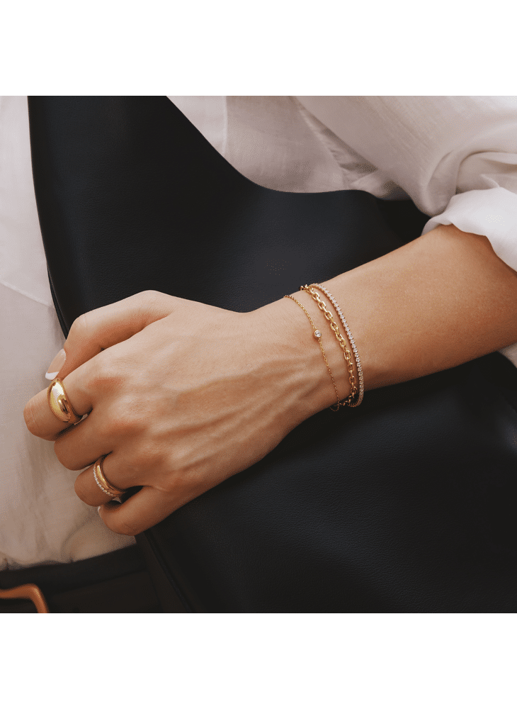 De armband is versierd met delicate zirkonia’s in bezelzetting, die een zachte glans toevoegen zonder te overheersen. Een veelzijdige stapelarmband die moeiteloos combineert met andere sieraden of solo gedragen kan worden voor een minimalistische, elegante look.