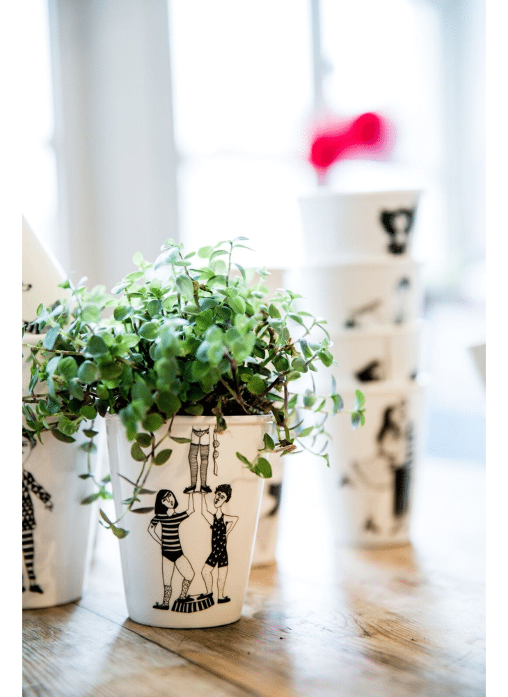 In een sociale werkplaats in Gent worden de helen b tekeningen design per design op het porselein gezet en wordt het porselein afgebakken in keramiekovens op 840°C. Dat zorgt ervoor dat al het porselein vaatwas- en ovenbestendig is!