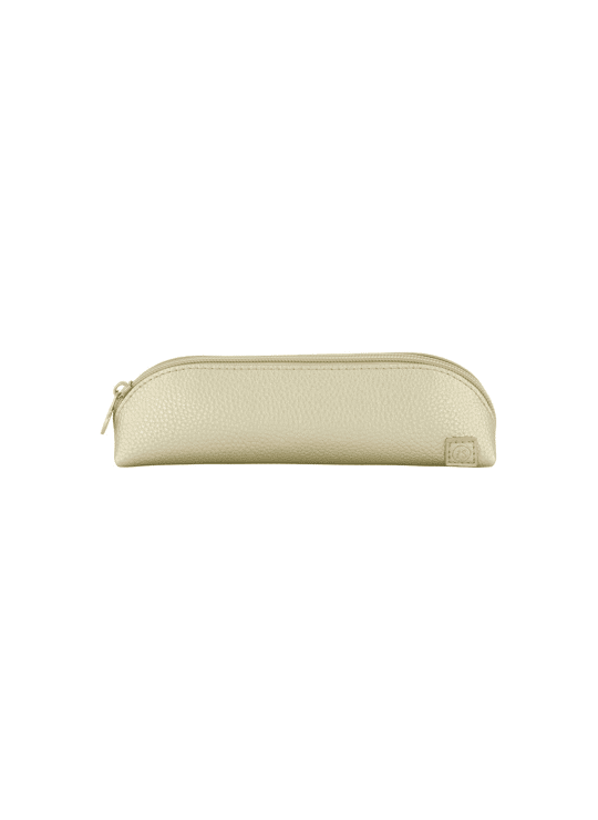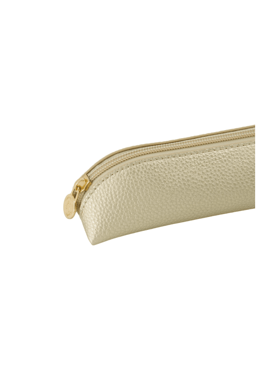 In deze gouden etui van Zusss bewaar jij de fijnste schrijfwaren. Aan de ritssluiting van de etui hangt een muntje met daarop het Zusss logo.