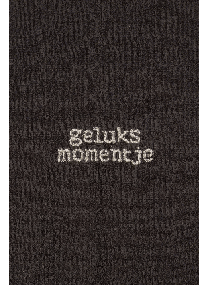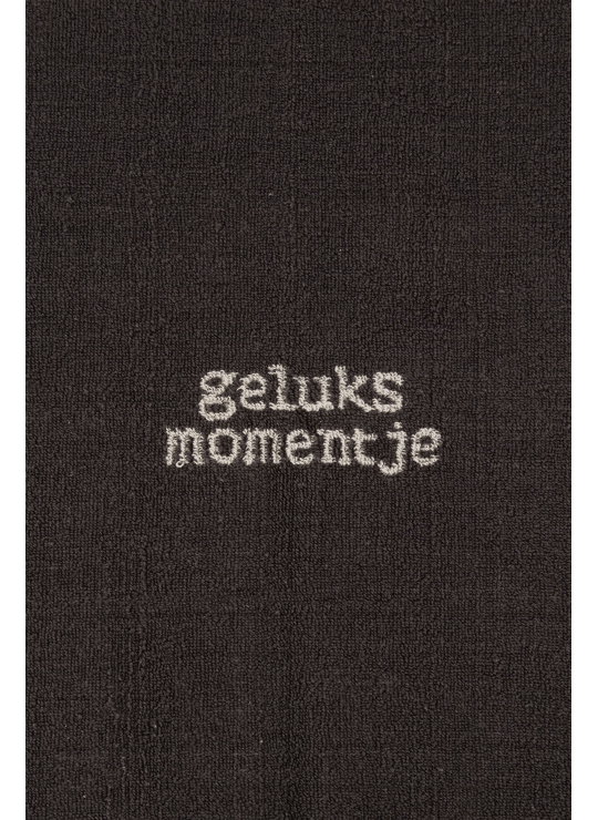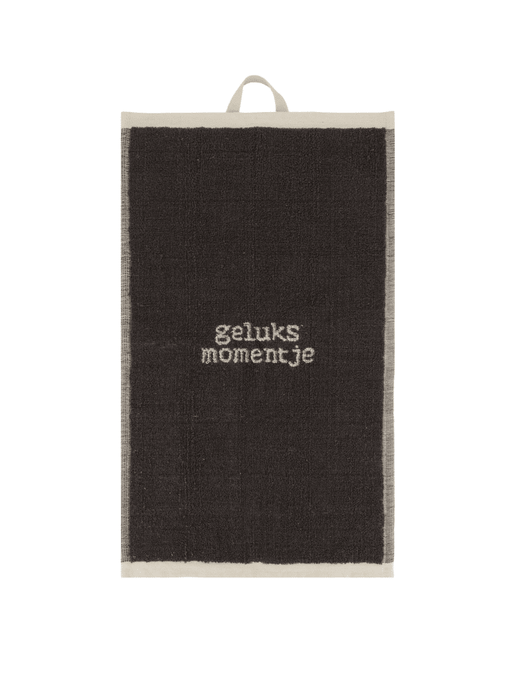 Het gastendoekje is zand en antracietgrijs van kleur. Op het doekje staat de tekst: geluksmomentje.
