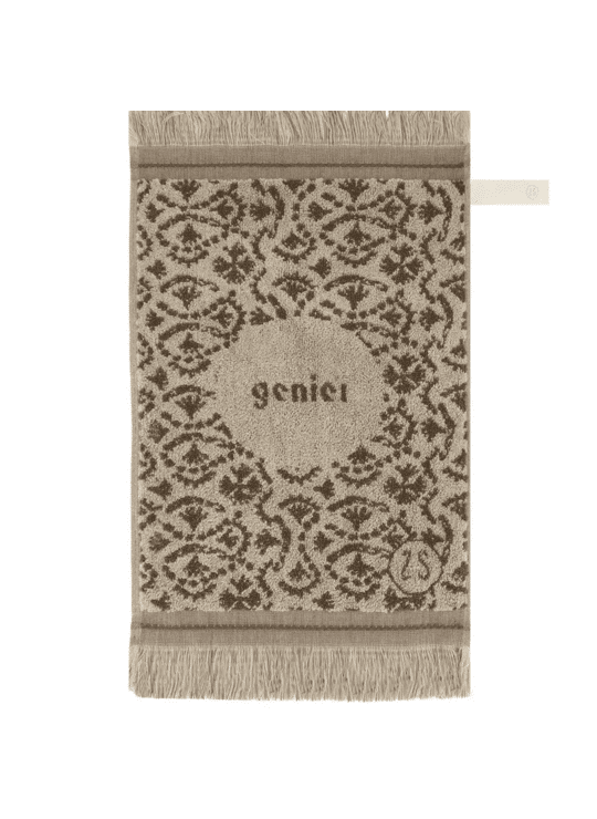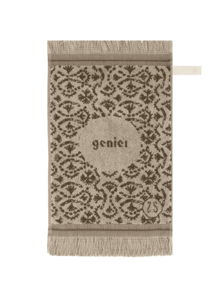 Het gastendoekje is zand en leem van kleur. Op het doekje staat de tekst: geniet.