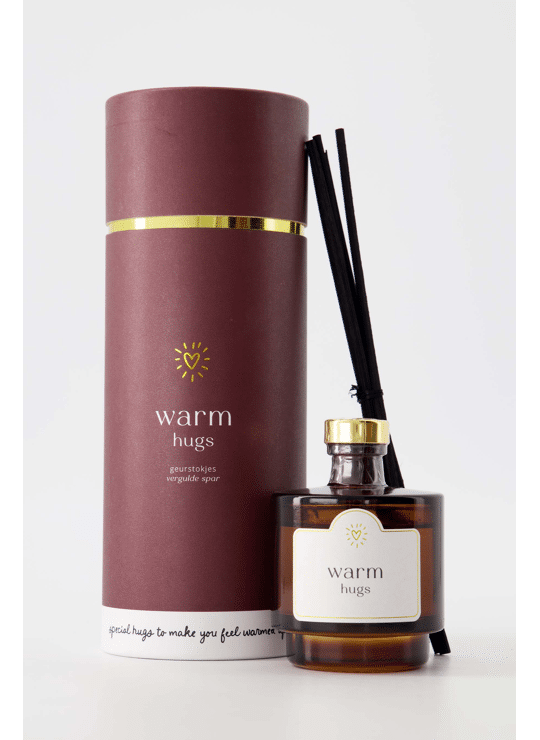 De geur zit in een stijlvol bruin glazen flesje met zwarte stokjes, die niet alleen zorgen voor een natuurlijke uitstraling maar ook een vleugje elegantie toevoegen aan elk interieur. De donkerrode cadeaukoker met gouden accenten en de tekst Warm Hugs maakt het geheel compleet — een prachtig cadeau vol warmte en aandacht. 🎁