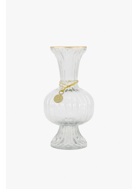 Dit glazen vaasje is een echte eyecatcher! Dit vaasje heeft een unieke vorm en heeft rondom ribbels. Een leuk detail is het gouden randje aan de bovenkant en het hangertje om de hals van de vaas. Zet dit te gekke ding op je salontafel en combineer met een mooie kandelaar!