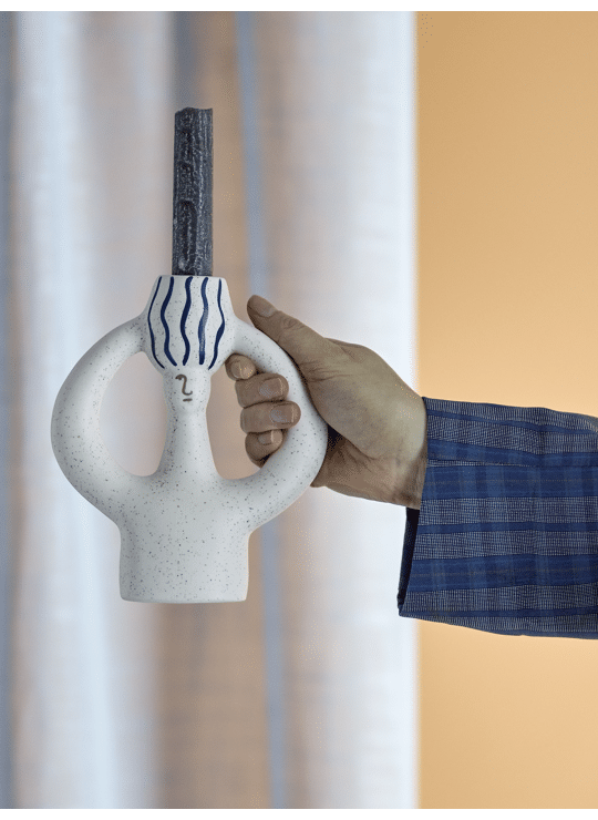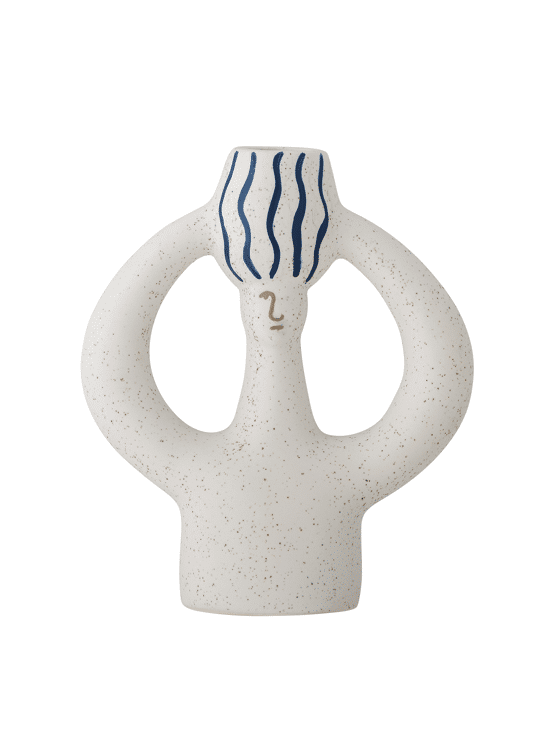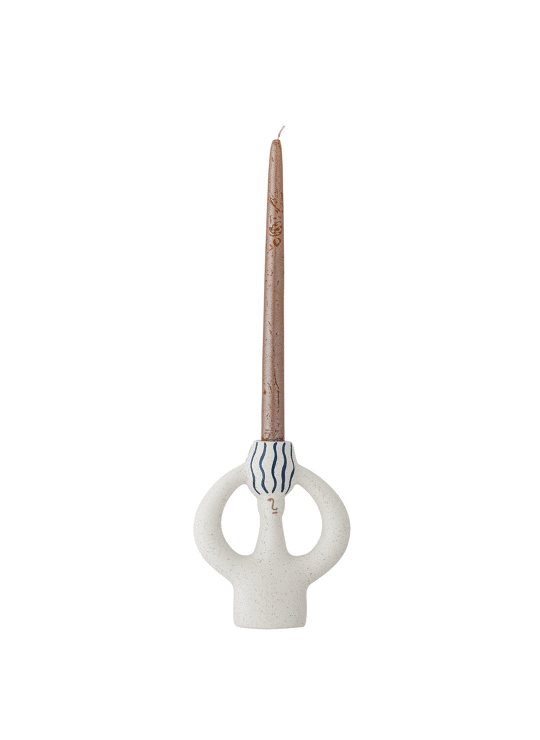 De Hatty kaarsenhouder, gemaakt van steengoed, heeft een eenvoudig ontwerp met een grafische touch. De handgeschilderde blauwe lijnen tegen de neutrale achtergrond zorgen voor een rustige harmonie. De eenvoudige, kleurrijke details creëren een decoratieve maar veelzijdige kaarsenhouder die gemakkelijk te integreren is in verschillende huizen en woonstijlen.