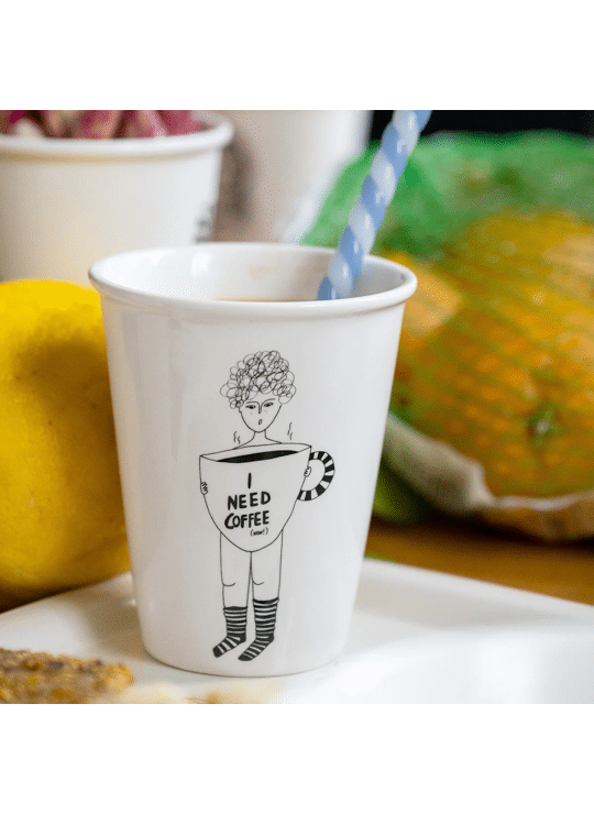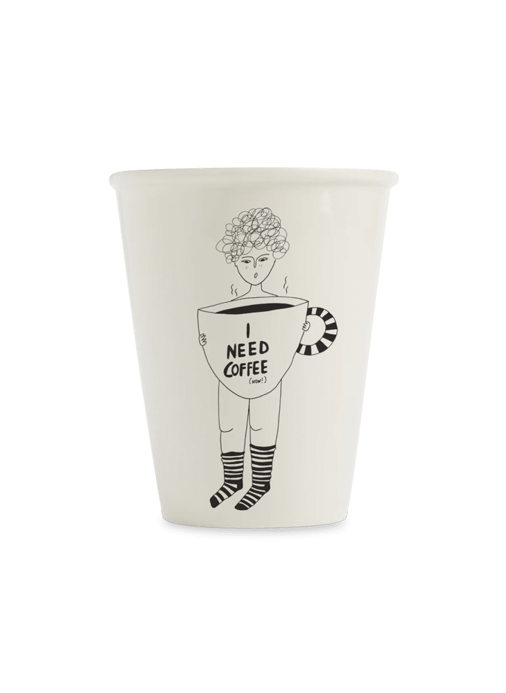 De helen b Cup ‘Coffee Now’ is een handgemaakte porseleinen beker met een zwarte lijntekening op een gebroken witte achtergrond – minimalistisch, speels en helemaal in de typische helen b-stijl.
