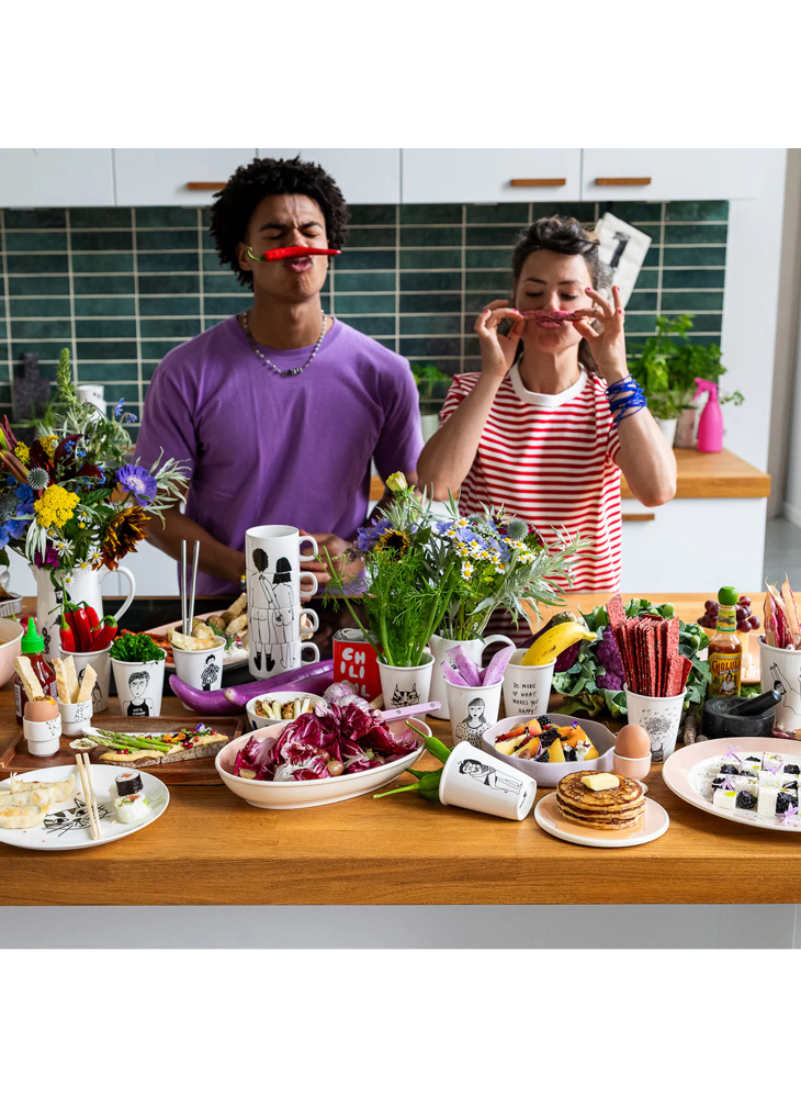 In een sociale werkplaats in Gent worden de illustraties zorgvuldig met de hand op elk stuk porselein aangebracht, waarna alles wordt afgebakken op 840°C. Dat maakt het vaatwas- en ovenbestendig, en dus perfect voor dagelijks gebruik.