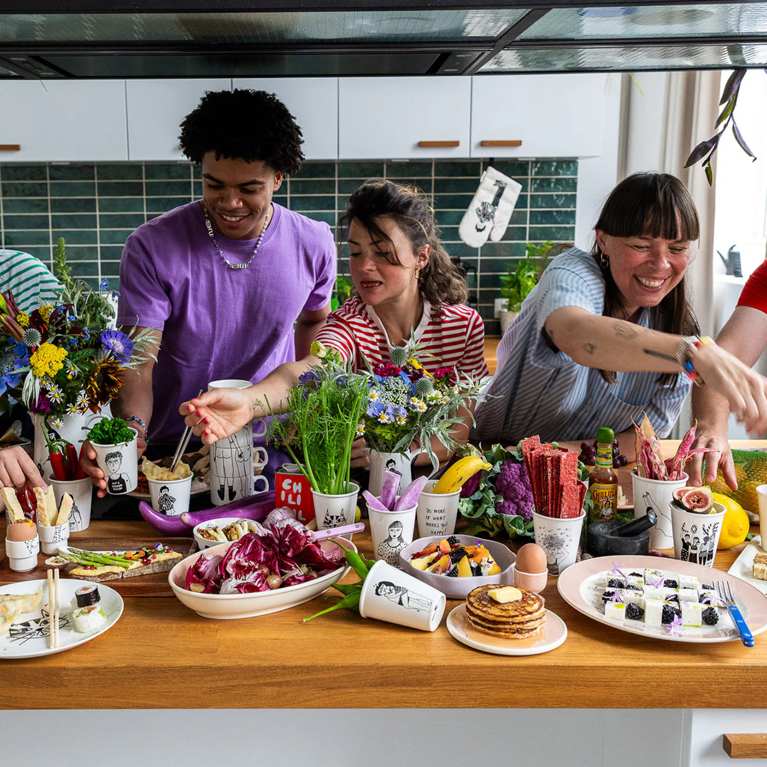 In een sociale werkplaats in Gent worden de herkenbare tekeningen met de hand op elk stuk porselein aangebracht, waarna ze afgebakken worden op 840°C. Dat maakt elk item vaatwas- en ovenbestendig – duurzaam, praktisch en met een flinke dosis vrolijkheid.