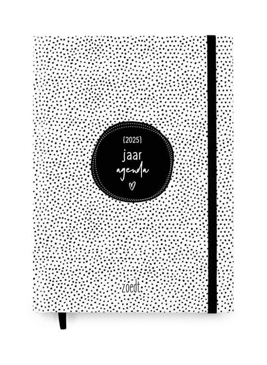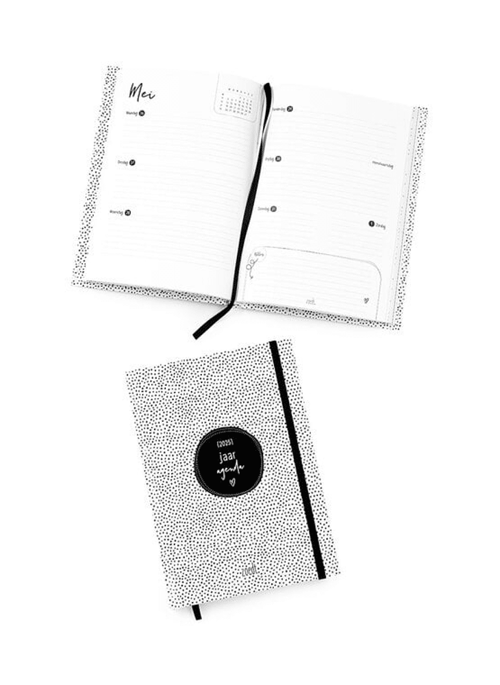 Mooie A5 hardcover jaaragenda 2025 (met laminaat ter bescherming), een leeslint en sluitelastiek. Het binnenwerk is van stevig, niet glimmend, papier met onder andere: