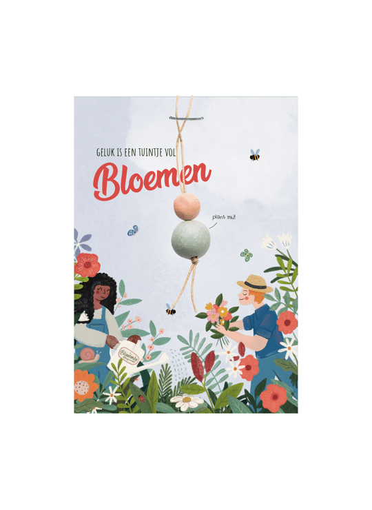 Kaart met gelukspoppetje en 2 zaadbommetje Geluk is een tuintje vol bloemen / Blossombs