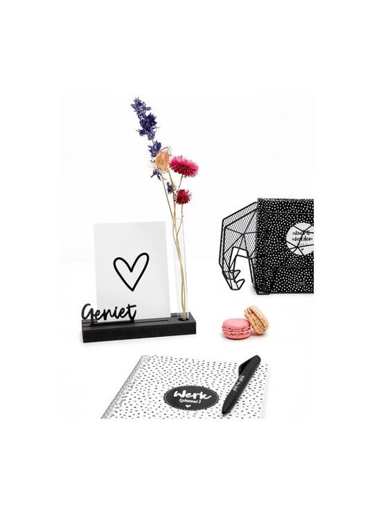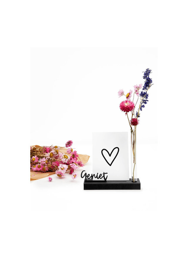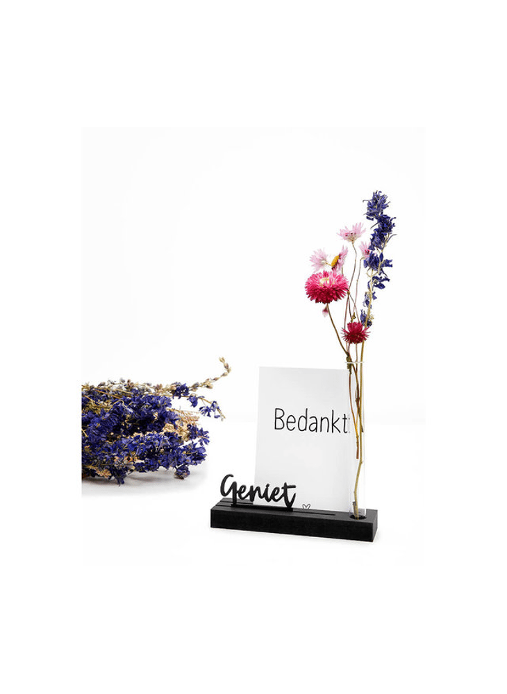 Mooie zwarte houten kaartenhouder met vaasje en tekst Geniet. Een kaarthouder om een mooie kaart of foto een bijzonder plekje te geven.