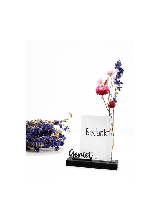 Kaarthouder met vaasje en tekst geniet / Zoedt