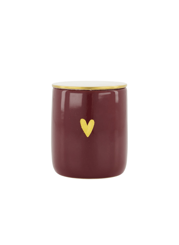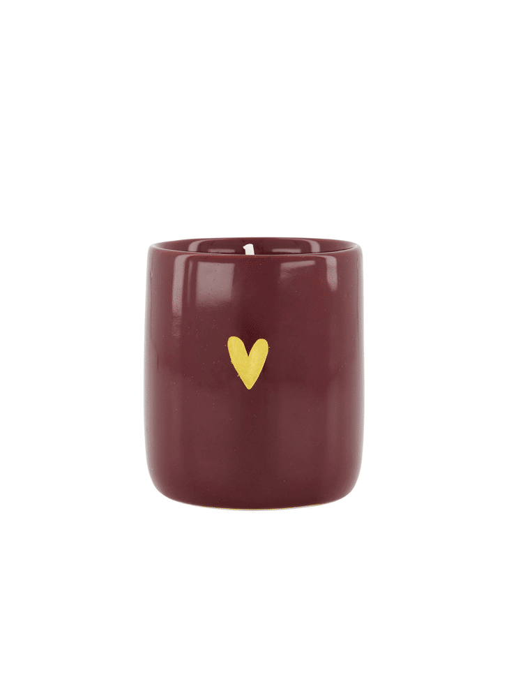 Deze kaars zit in een keramieken potje met een donkerrode kleur en een gouden hartje.