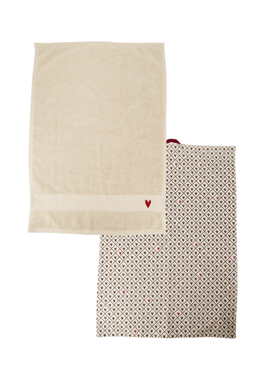 Deze Zusss keukenset brengt sfeer en gezelligheid in jouw keuken. De keukenset is uitgevoerd in een zachte zandkleur en bestaat uit twee handdoeken: een effen exemplaar met een fijne structuur en een rood geborduurd hartje en een zachte theedoek met een hartjespatroon. De keukenset hartjes is perfect voor dagelijks gebruik en geeft een warme, eigenzinnige touch aan je keukentextiel. Voeg deze charmante keukenset hartjes toe aan je collectie keukenaccessoires voor net dat beetje extra sfeer.