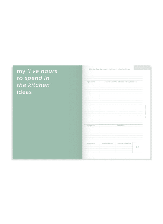 In deze Kitchen-Journal verzamel je je eigen favoriete recepten. Recepten voor een snelle maaltijd of een heerlijk avondje met vrienden aan tafel. Die heerlijke soep van oma of dat lekkere Spaanse wijntje dat zo goed bij vis past. En het recept van het toetje uit je favoriete restaurant dat je eindelijk los hebt gepeuterd.