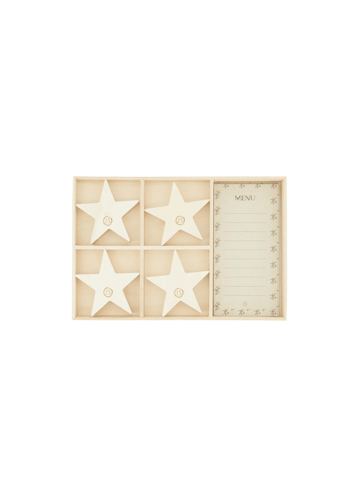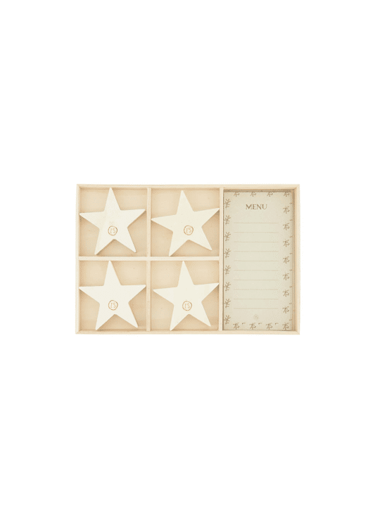 Dit houten doosje zit gevuld met vier papieren menukaartjes en vier houten sterretjes waar je het menukaartje in kunt stoppen.