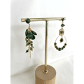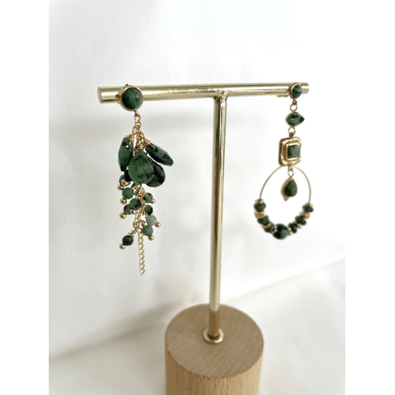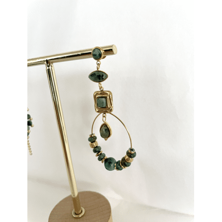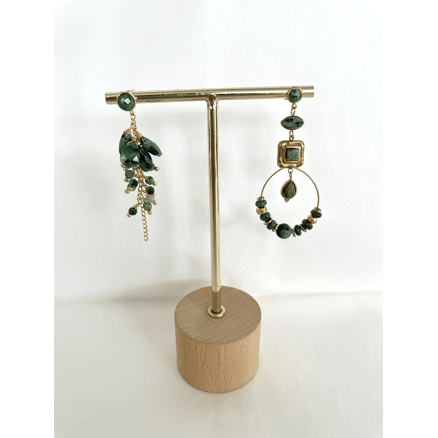 Assymetrische oorstekers met bohemian ontwerp afgewerkt met groene natuursteen.