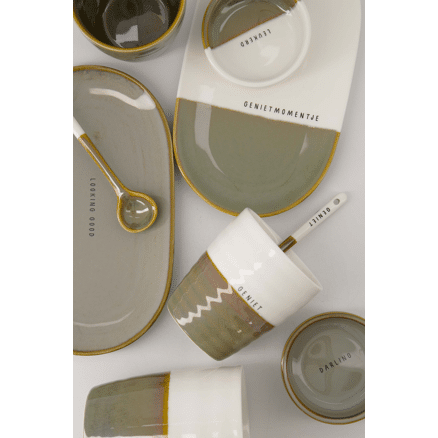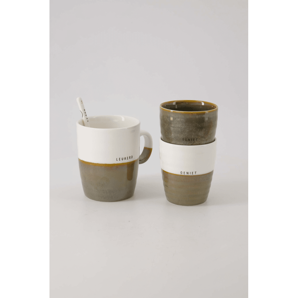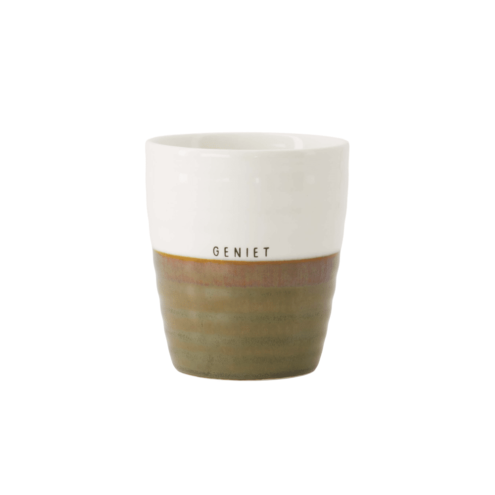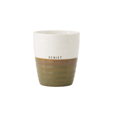 Deze Zusss koffiemok is perfect voor wie even wilt ontspannen met een warme drank. Deze mok valt op door zijn warme wit en donkergroene kleurenspel, wat zorgt voor een natuurlijke en gezellige uitstraling in je keuken. De mok geeft met het woord ‘geniet’ een subtiele reminder om stil te staan bij het moment. Dankzij het stevige keramiek ligt hij prettig in de hand en is hij ideaal voor dagelijks gebruik. Voeg deze koffiemok toe aan je keukencollectie en geniet van elk kopje koffie op jouw manier.