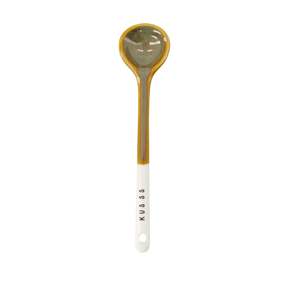 Dit Zusss lepeltje combineert functionaliteit met een warm ontwerp, perfect voor elke liefhebber van keukenaccessoires. Het keramiek lepeltje komt in de kleur wit met donkergroene accenten, wat zorgt voor een subtiele, natuurlijke uitstraling. Het lepeltje voelt prettig aan en is ideaal voor het serveren of proeven tijdens het koken. Met het woord ‘Kusss’ op het handvat, brengt dit lepeltje een vrolijke noot aan je dagelijkse keukenmomenten.