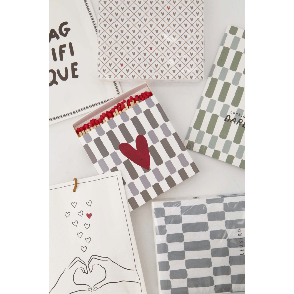 Deze Zusss lucifers brengen warmte en gezelligheid in je woonkamer. Deze lucifers met het opvallende rode hartje op het doosje zijn perfect om kaarsen aan te steken en sfeer toe te voegen aan elke gelegenheid. De lucifersdoos heeft een stijlvol grijs/groen patroon dat mooi staat in ieder interieur.