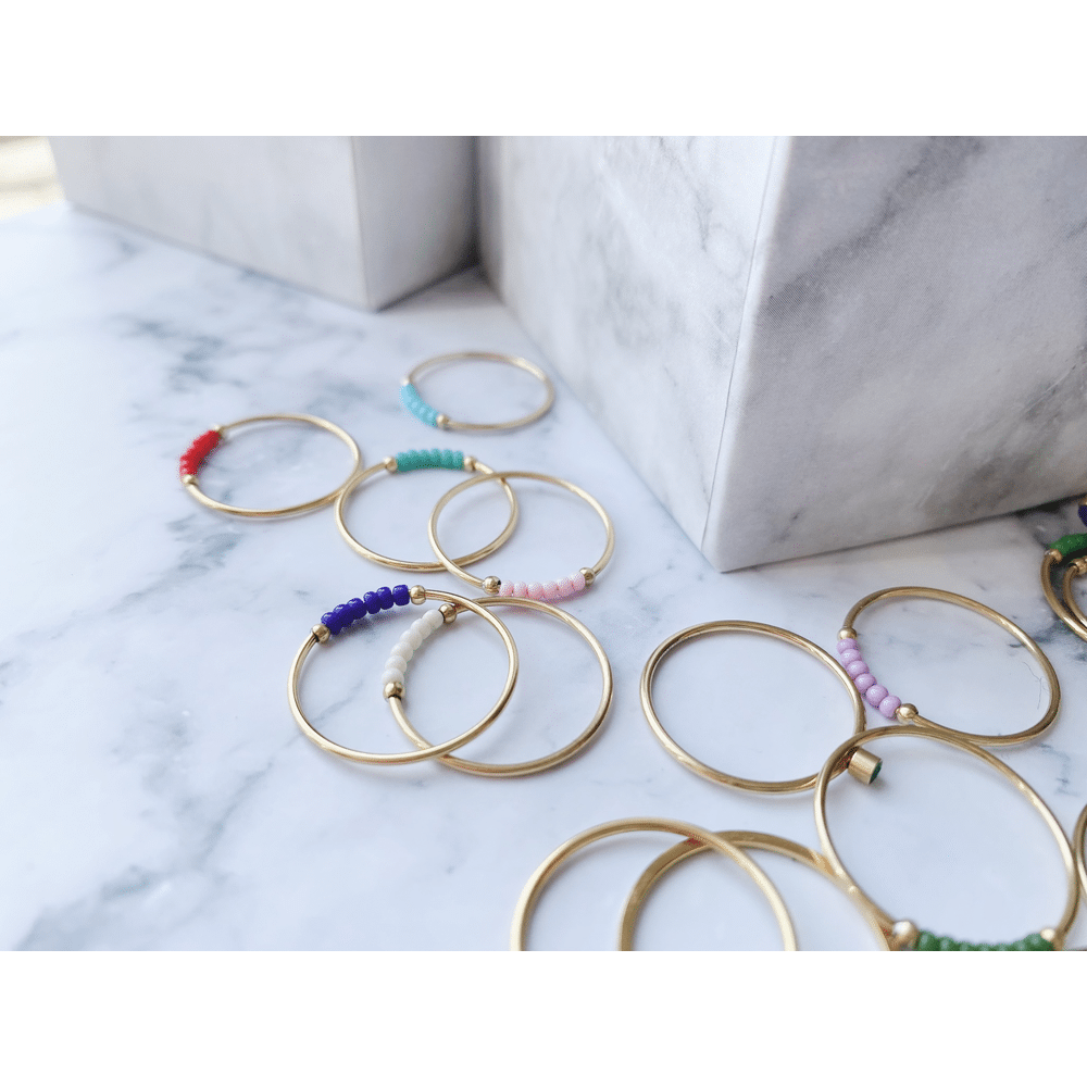 Ring van 1mm versierd met 5 draaiende gekleurde kraaltjes.