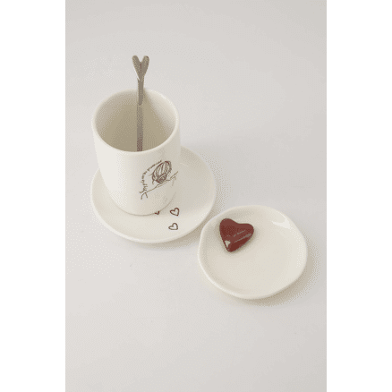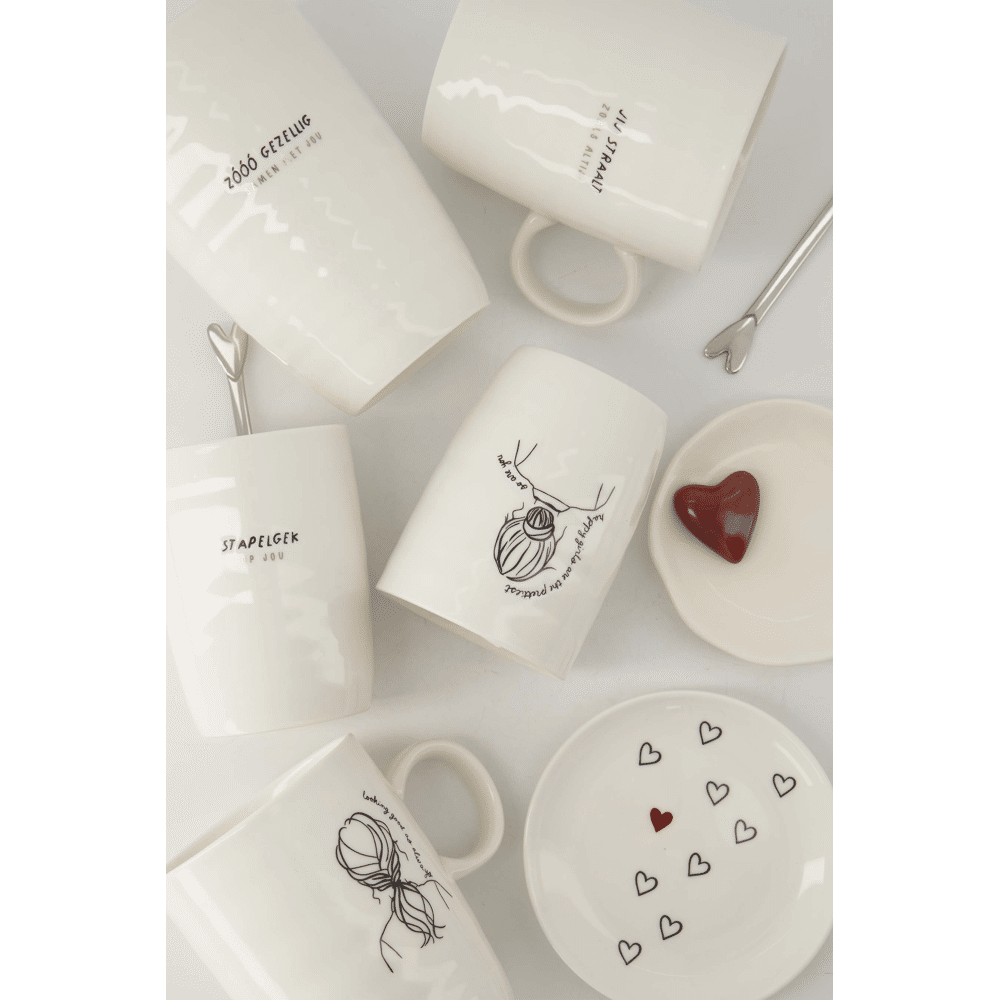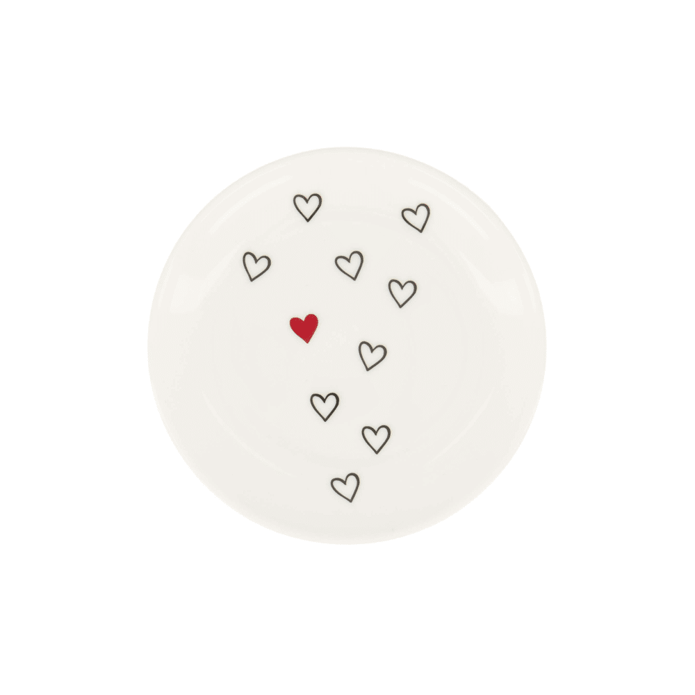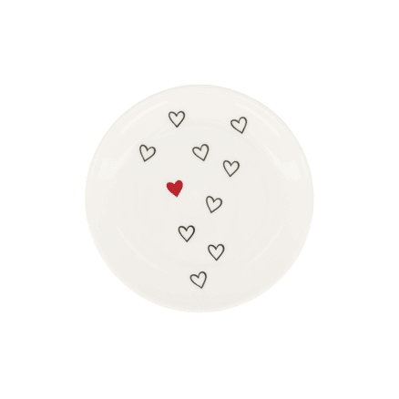 Dit witte schaaltje van Zusss met speelse zwartomlijnde hartjes en een opvallend portkleurig hartje geeft je tafel nét dat beetje extra. Perfect om kleine hapjes of lekkers op te presenteren. Dit schaaltje past prachtig in de collectie keukengerei van Zusss en voegt een warme, persoonlijke touch toe aan je dagelijkse momenten.