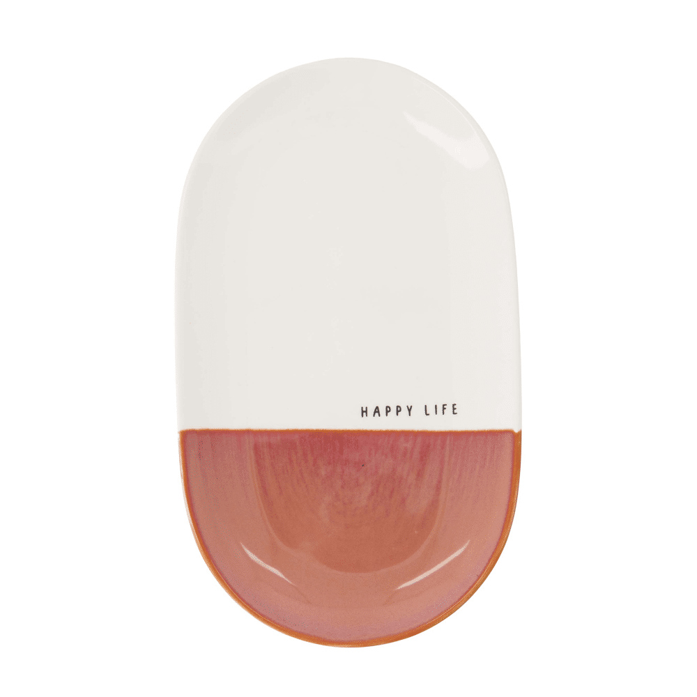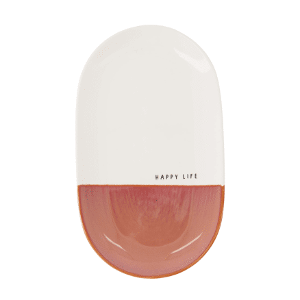 Deze serveerschaal van Zusss valt op door het warme wit gecombineerd met een bordeaukleurige onderkant en de subtiele tekst Happy Life. Perfect om hapjes of broodjes stijlvol te presenteren. Dankzij het keramische materiaal voelt de schaal stevig en kwalitatief aan, en is hij eenvoudig te combineren met andere keukenspullen. Deze serveerschaal brengt een warme sfeer aan tafel en past mooi in elke keuken.