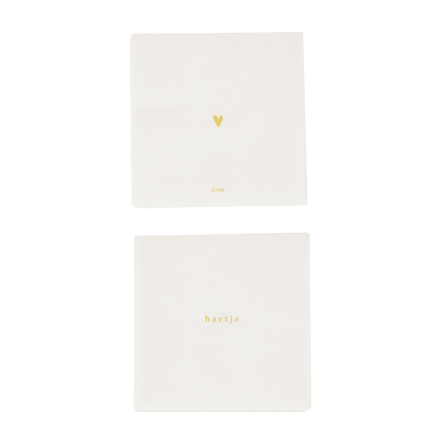 Deze Zusss servetten brengen een warme sfeer in huis. Deze basic witte servetten hebben aan de ene zijde een gouden hartje staan en op de andere zijde staat het woord 'hartje'. Perfect voor sfeervolle diners en gezellige bijeenkomsten.