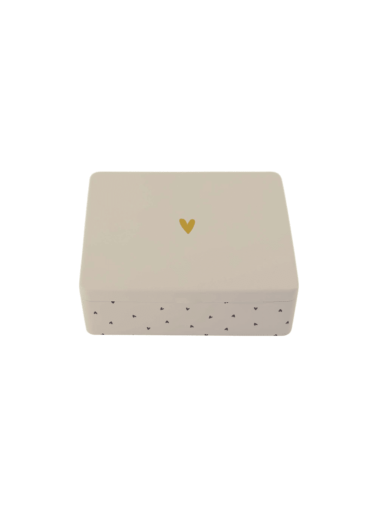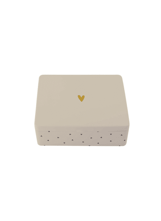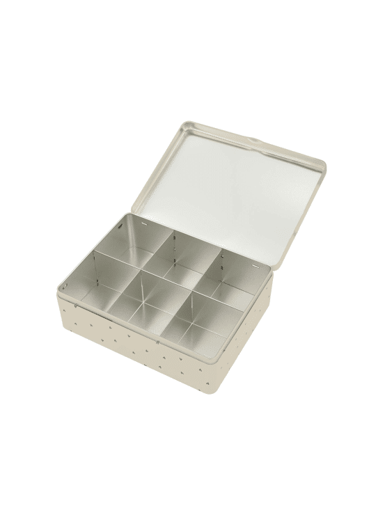 Dit metalen theeblik is een heel fijn cadeautje voor een theeliefhebber. Het blik is versierd met een hartjespatroon en heeft 6 vakjes.