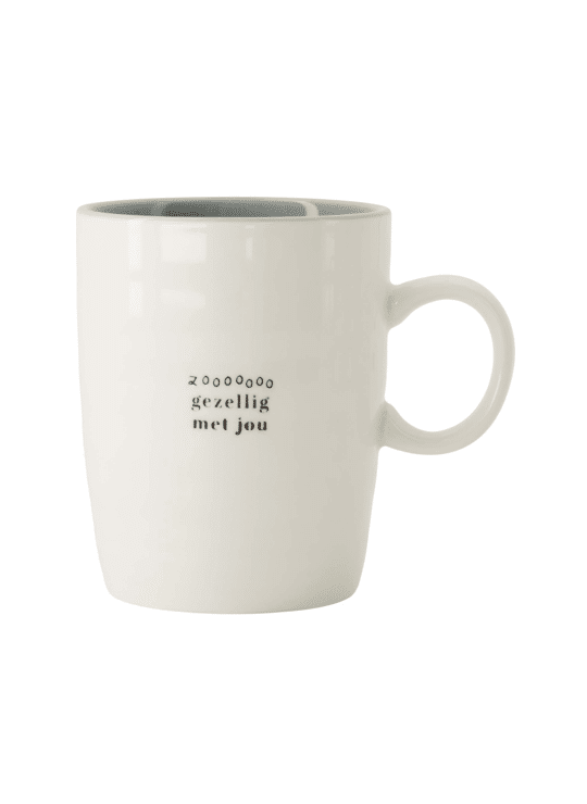 Deze Zusss theemok is perfect voor iedereen die houdt van een momentje rust met een warme drank. Deze theemok straalt gezelligheid uit en past mooi in de keuken collectie. De mok is wit van buiten met een subtiele grijsblauwe binnenkant en zwarte tekst die zegt: “zo gezellig met jou”. Dankzij de fijne vorm ligt deze theemok prettig in de hand en maakt jouw koffie- of theemoment extra bijzonder. Een eenvoudige, maar sfeervolle toevoeging aan jouw dagelijkse ritueel.