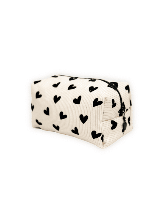 Wat een prachtige toilettas is dit! Gemaakt van ribstof met een hartjesprint. Superleuk voor al je make-up en toiletartikelen. Ga je op reis of een nachtje weg, uit logeren of naar een festival? Ga dan volledig in hartjes stijl! :-)