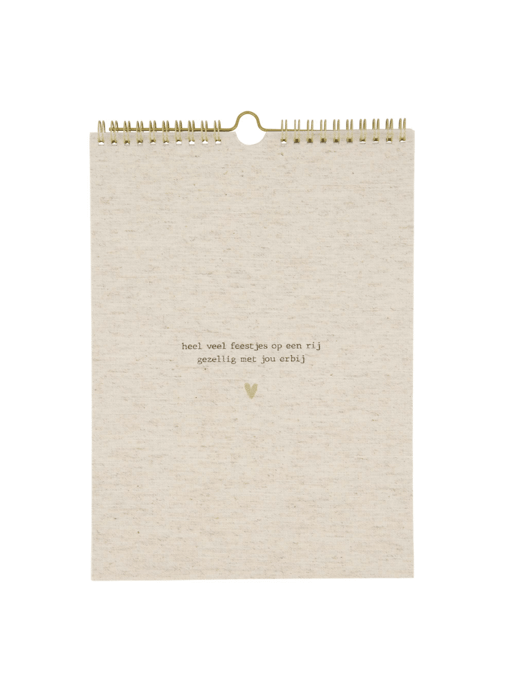 De kalender heeft een cover van linnen. Op de voorkant staat: heel veel feestjes op een rij, gezellig met jou erbij.