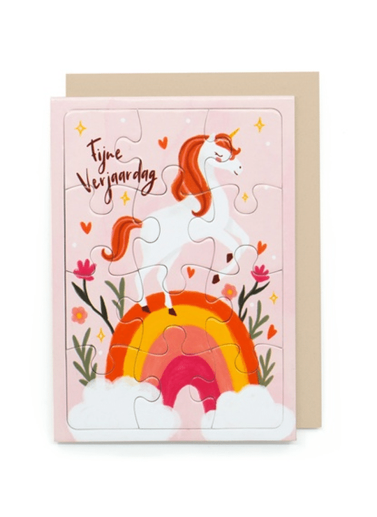 Dubbele wenskaart met op de voorzijde een puzzel die het kleine feestbeest meteen kan maken. Een klein cadeautje bij het kaartje. Wat leuk!