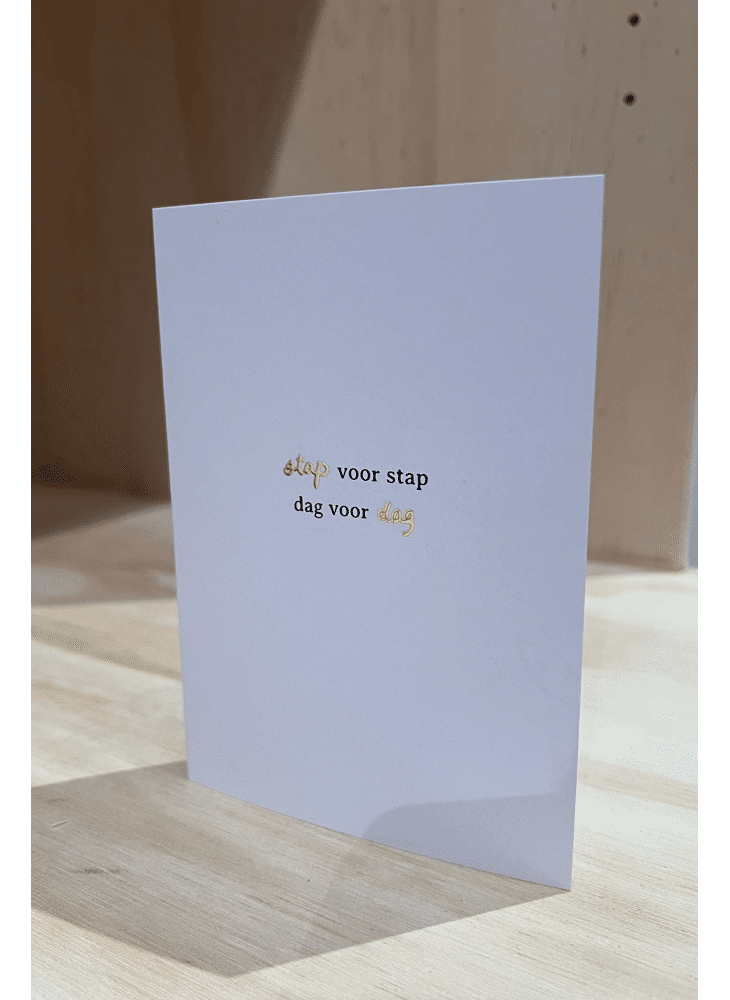 Wenskaart met gold foil letters. Op de kaart staat vooraan de tekst: 'stap voor stap, dag voor dag'.