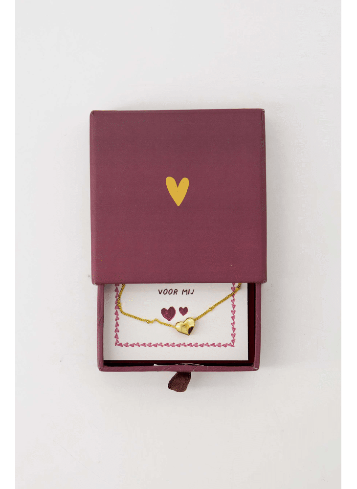 Het fijne armbandje zit op het kaartje en is versierd met een gouden hartje en een subtiele ketting met bolletjes, wat zorgt voor een elegante, vrouwelijke uitstraling. 🌿