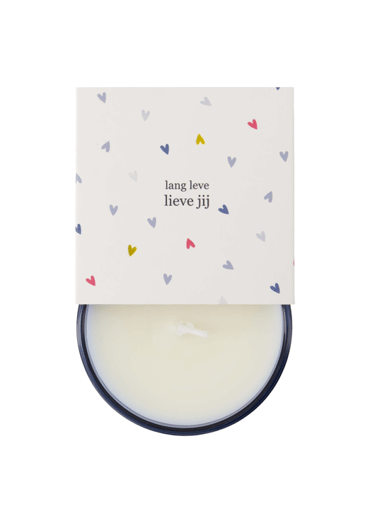 De kaars zit in een blauwe glazen houder met een stijlvolle wikkel waarop een lieve tekst en kleurrijke hartjes staan. Dit speelse design maakt de geurkaars niet alleen een sfeermaker, maar ook een leuk decoratief item in je interieur.