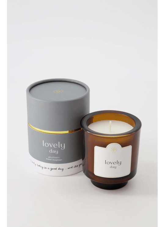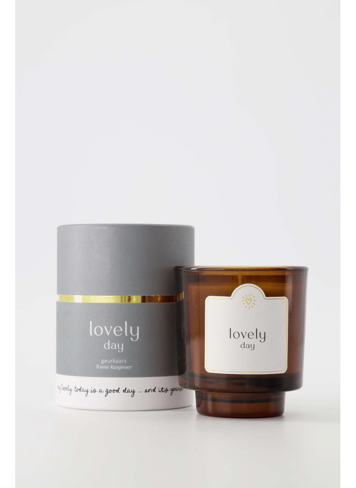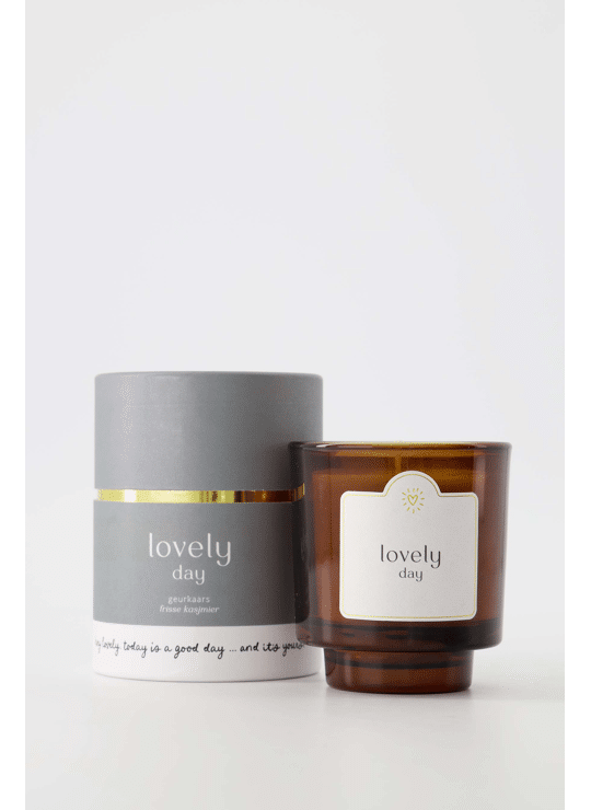 De kaars zit in een stijlvol bruin glazen potje dat een mooie, zachte gloed verspreidt zodra je het aansteekt. Op het glas prijkt een subtiele sticker met de tekst “Lovely Day”, die meteen een positieve sfeer oproept.