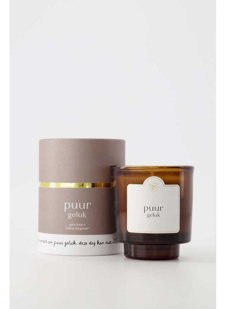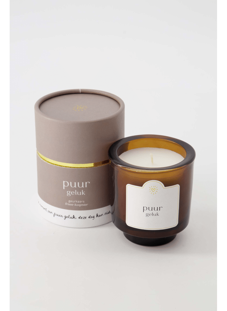 De kaars wordt geleverd in een zandkleurige cadeaukoker met subtiele gouden accenten en de tekst Puur Geluk, waardoor het ook een prachtig cadeau is om te geven. 🎁