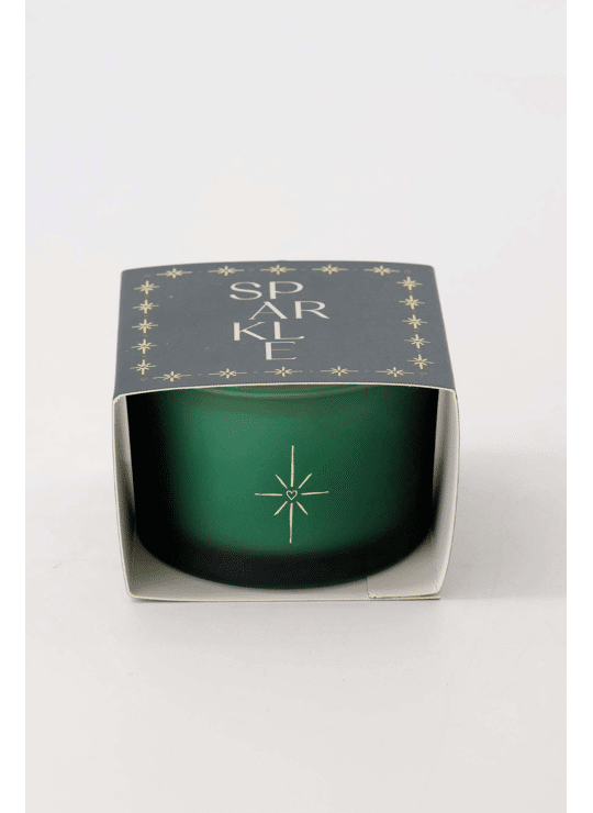 Dit sfeervolle kaarsje zit in een donkergroen glazen potje met een subtiele gouden ster en hartje en is omhuld met een wikkel met de tekst sparkle.