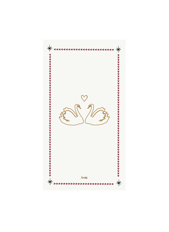 Maak elk etentje of feest extra bijzonder met de stijlvolle Zusss servetten. Op de voorkant staat de lieve tekst “Maak magische momenten met de allerliefste mensen” op een witte achtergrond, omlijst met subtiele hartjes. De achterzijde is versierd met een tekening van twee zwanen met een hartje, wat een romantisch en warm accent geeft.